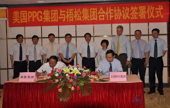 公司董事長孔仕才與美國PPG工業(yè)公司中國區(qū)總經(jīng)理?xiàng)钚l(wèi)華(右)簽約