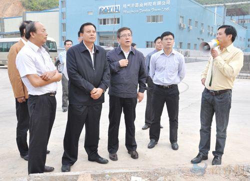 自治區(qū)人民政府副主席楊道喜(左二),梧州市長(zhǎng)王凱(中)、副市長(zhǎng)彭健銘(右二),梧松董事長(zhǎng)孔仕才(左一),總經(jīng)理車(chē)乾池(右)