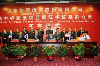 6月17日,華泰紙業(yè)45萬噸高檔銅版紙項目國際招標采購合同簽字儀式在華泰工業(yè)園舉行。東營市市委常委、廣饒縣縣委書記趙豪志,縣長田和友,市經(jīng)貿(mào)委副主任龍艦,縣委常委、大王鎮(zhèn)黨委書記楊同賢等政府領導,集團董事長李建華,以及中標單位美卓造紙與紙漿總裁Bertel、安德里茲亞洲區(qū)副總裁Gary、ABB亞太區(qū)域銷售經(jīng)理Jean—christophe bussolaro、長沙長泰輸送包裝設備有限公司總經(jīng)理簡澤豐等出席簽字儀式。儀式由山東齊信招標公司趙欽軍經(jīng)理主持。