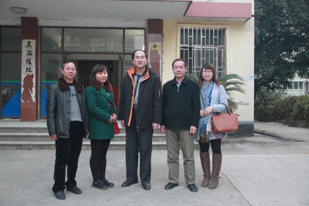 桂林松泉林化工業(yè)有限責(zé)任公司廣西桂林化工廠總經(jīng)理彭焰(左三)、經(jīng)營(yíng)部部長(zhǎng)張學(xué)勇(右二)、興松林化總經(jīng)理唐春潮(左一)與走訪團(tuán)合影
