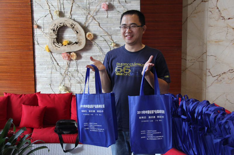 (華訊松香網(wǎng)業(yè)務部經(jīng)理吳明宇在展示已裝好的論壇資料袋)