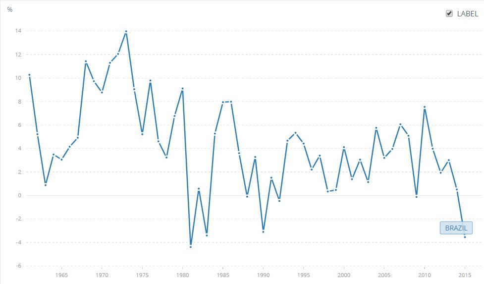 隨后,在工業(yè)化的推動下,巴西在1948€€1979年期間,GDP平均增長率達7.2%,其中,1968€€1973年期間,更取得了10%以上的高速增長,被稱為“巴西奇跡”。