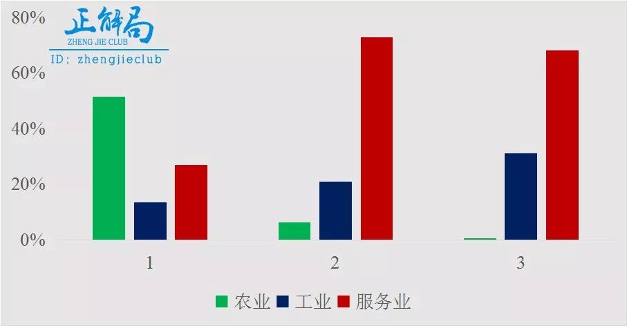在我們的認知里,一二三產業(yè)(簡單對應農業(yè)、工業(yè)、服務業(yè)),越發(fā)達所占比重相應越來越高。我們能確定國家1是尼泊爾,但是國家2、3呢?
