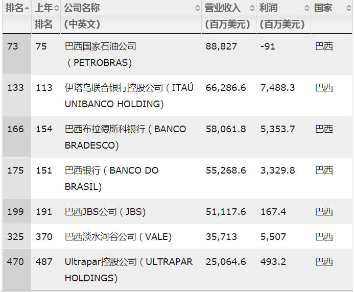更直觀的反映是,在2018年福布斯世界企業(yè)500強中,巴西一共入圍7家,從名字就能看出來2-4位是金融企業(yè)。剩下的里面,巴西國家石油公司和Ultrapar控股公司,一個主業(yè)是石油,一個是天然氣,JBS是肉食加工企業(yè),淡水河谷是鐵礦石生產和出口商。