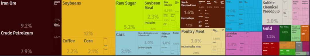 比如,前面說過的巴西淡水河谷是全球最大鐵礦石出口商,。巴西還是全球最大的咖啡、牛肉、蔗糖、雞肉出口國。