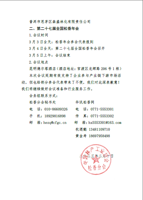 關(guān)于再次延期召開(kāi)第二十七屆全國(guó)松香年會(huì)的通知