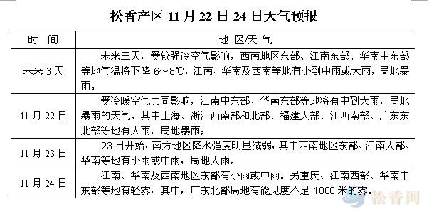 華訊松香網(wǎng)溫馨提醒:未來三日,受較強冷空氣影響,西南地區(qū)東部、江南東部、華南中東部等地氣溫將下降6~8℃。另局部受冷暖空氣共同影響,將迎來明顯降雨過程,其中江南中東部、華南東部等地將有中到大雨,局地暴雨的天氣。多數(shù)產(chǎn)區(qū)臨近產(chǎn)季尾期,頻繁的降溫降雨天氣或使采脂工積極性進一步降低,局地采脂工下山步伐或加快。