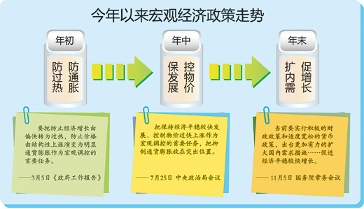從年初的防過熱、防通脹,到年中的保發(fā)展、控物價,再到年末的擴內(nèi)需、促增長,一年下來,宏觀經(jīng)濟政策多次調(diào)整。