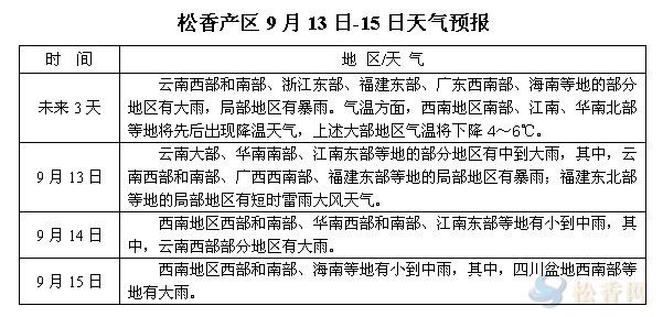 華訊松香網(wǎng)溫馨提醒:未來三天,兩廣、云南、福建、江西等地降雨范圍有所擴(kuò)大,其中廣西西南部、廣東、云南大部、福建東部等地區(qū)有中到大雨或暴雨。氣溫方面,受較強(qiáng)冷空氣影響,江南大部將出現(xiàn)4-6℃的降溫,晝夜溫差較前加大。另今年第16號(hào)強(qiáng)熱帶風(fēng)暴“三巴”于9月12日20時(shí)加強(qiáng)為臺(tái)風(fēng),未來2天對(duì)我國暫無影響。本周,江西、福建、云南等產(chǎn)區(qū)松脂量較前有不同程度增加,但整體脂量較往年同期仍偏少。隨著降雨降溫天氣的來臨,后期松脂量能否持續(xù)釋放仍有待觀察。