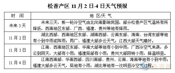 華訊松香網(wǎng)溫馨提醒:未來三日,新一輪冷空氣將由北至南影響我國,部分松香產(chǎn)區(qū)降溫明顯,另廣西、云南、福建、貴州等地迎來小到中雨,降溫降雨天氣或使得松脂工生產(chǎn)積極性降低,市場松脂量或仍維持緩慢釋放狀態(tài)。