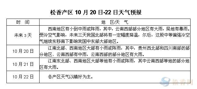 華訊松香網(wǎng)提醒:未來三天松香產(chǎn)區(qū)除了云南部分地區(qū)有降雨之外,其他地區(qū)天氣變化不大。值得關(guān)注的是,將有一股強(qiáng)冷空氣影響我國(guó)北部,之后會(huì)東移南下影響我國(guó)中東部大部分地區(qū),屆時(shí)或?qū)⒂绊懡?、福建等產(chǎn)區(qū)最后一批松脂的下山。