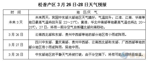 華訊松香網(wǎng)溫馨提示:未來三天,中東部大部地區(qū)天氣晴好,兩廣、江西、福建等地氣溫回升明顯,有利于上山作業(yè),各產(chǎn)區(qū)注意把握好時(shí)間開展前期采脂準(zhǔn)備工作。云南局部地區(qū)有小雨,但降水基本保持稀少的格局。