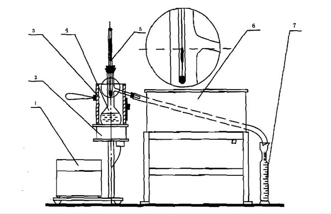 6、初餾點(diǎn)和餾程儀器設(shè)備:(符合SH/T 0121-1992的各項(xiàng)要求)①電器裝置。②電爐。③燒瓶罩。④恩氏蒸餾燒瓶(容量100mL)。⑤溫度計(棒式局浸式有膨脹室的水銀溫度計,范圍140-200℃,分度值0.5℃)。⑥冷凝管。⑦異徑量筒(容量100mL,)。⑧氣壓計。⑨石棉墊。⑩鐵架臺。11秒表。12冷凝器座架。13冷凝器水槽。