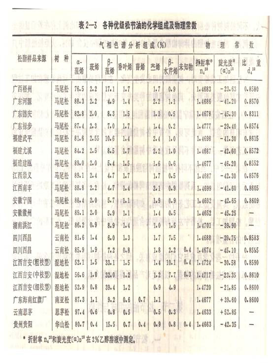 1979年中國(guó)林業(yè)科學(xué)研究院林產(chǎn)化學(xué)工業(yè)研究所采用氣相色譜法分析了我國(guó)一些松樹(shù)品種松脂中松節(jié)油(優(yōu)油)的組成,其結(jié)果見(jiàn)表2—3。