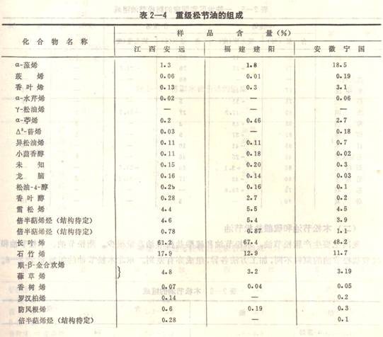 1980年,中國(guó)林業(yè)科學(xué)研究院林產(chǎn)化學(xué)工業(yè)研究所采用氣相色譜儀與氣一質(zhì)聯(lián)用儀對(duì)馬尾松松脂中重級(jí)松節(jié)油(松脂水蒸汽蒸餾180—200℃的餾份)的組成進(jìn)行了研究。油樣取自工廠(chǎng),分析的結(jié)果列于表2—4。