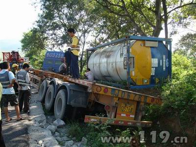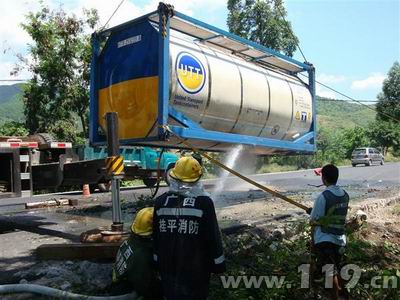 7月13日上午8時許,廣西桂平市發(fā)生一起車輛翻車事故,一輛滿載17噸松節(jié)油的槽罐車側(cè)翻在永培村路段路邊溝里,桂平消防中隊經(jīng)過3個多小時的掩護看守,成功處置這一危險事故,保住車主價值10萬美元的物資。